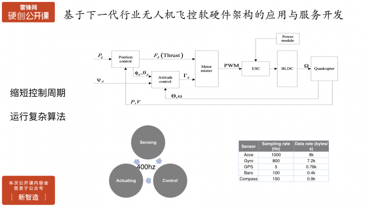 由于目前MEMS传感器的刷新能力和电机的响应能力来看,从飞行数据、姿态的解读到返回控制系统再到驱动电机去调整飞行姿态整个闭环走完,整个频率能达到400hz,如果我们基于下一代的飞控系统去改进的话,就能够将整个控制周期缩短,比如将频率提升,就能提升无人机的控制性能,并且能运行一些更加复杂的算法,让飞机的控制更加精准以满足行业需求。