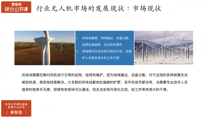 除了这个之外,电网还有一些非常深度的一些需求。比如风机的巡检,在风力发电厂,巡检人员需要知道叶片有没有破损、干体有没有倾斜、避雷针是否失效等信息,风力发电厂的风机设备都非常的昂贵,维护成本非常高,所以无人机对这类的巡检有天然的优势。