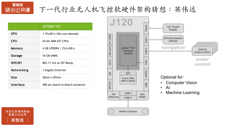 英伟达在之前也推出过用在无人机上的集成板卡。整个方案和高通大同小异。主要不同点在,英伟达有大规模的GPU去做一些基于视觉的高精尖的算法,缺点是功耗非常高。