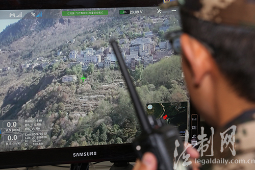 图为操作员操控无人机对樟木镇进行地质灾害排查
