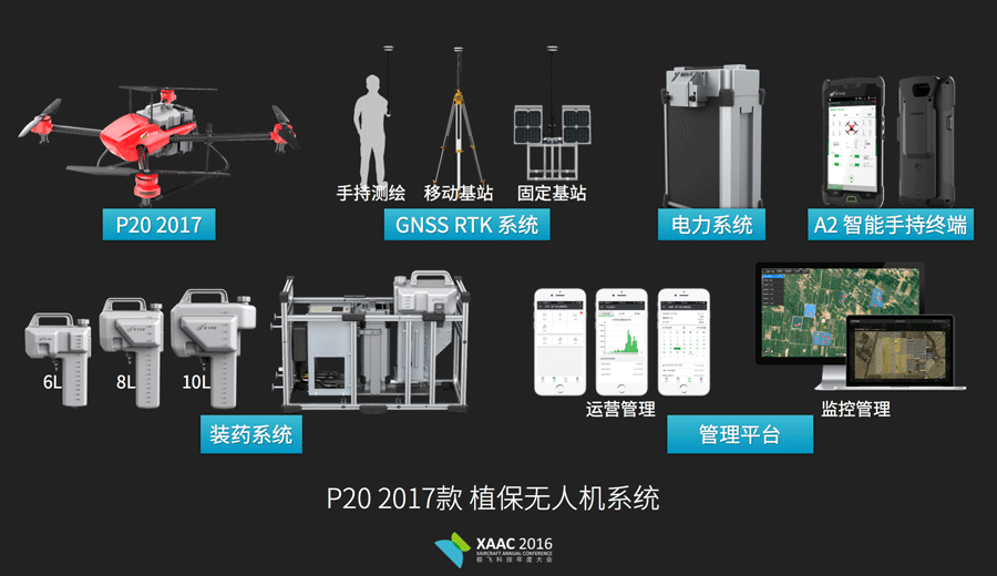 P20 2017 款植保无人机系统是目前市面上作业面积最大、精准和自动化结合的最好的植保无人机系统,包括 P20 无人机、动力系统、变量喷洒系统、装药系统、电力系统、GNSS RTK 农田测绘杆、移动基站与固定基站和农田测绘、植保作业 APP。