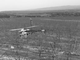 图为山西吉县益晖农资科技服务公司技术人员在果园上空正进行无人机授粉演示。