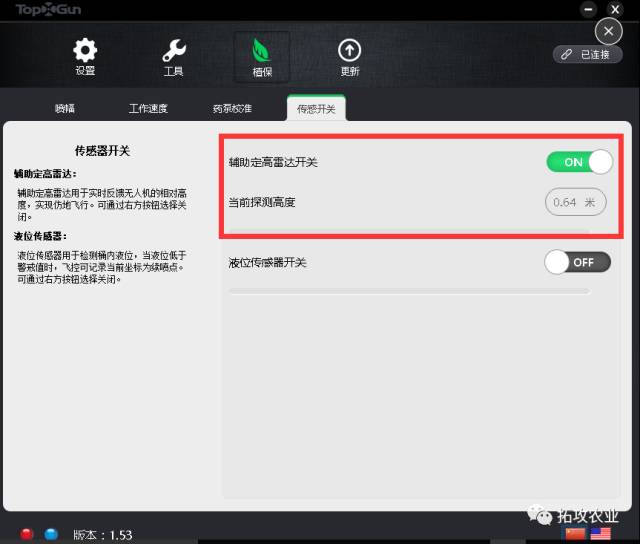 在安装时候呢,应尽量保证雷达模块垂直向下,并且正下方无遮挡。同时,严禁安装在雾化喷嘴周围,以防水雾影响雷达定高效果。另外呢,在安装完成以后,不要忘记在调参软件中把定高模块打开。如下图所示:
