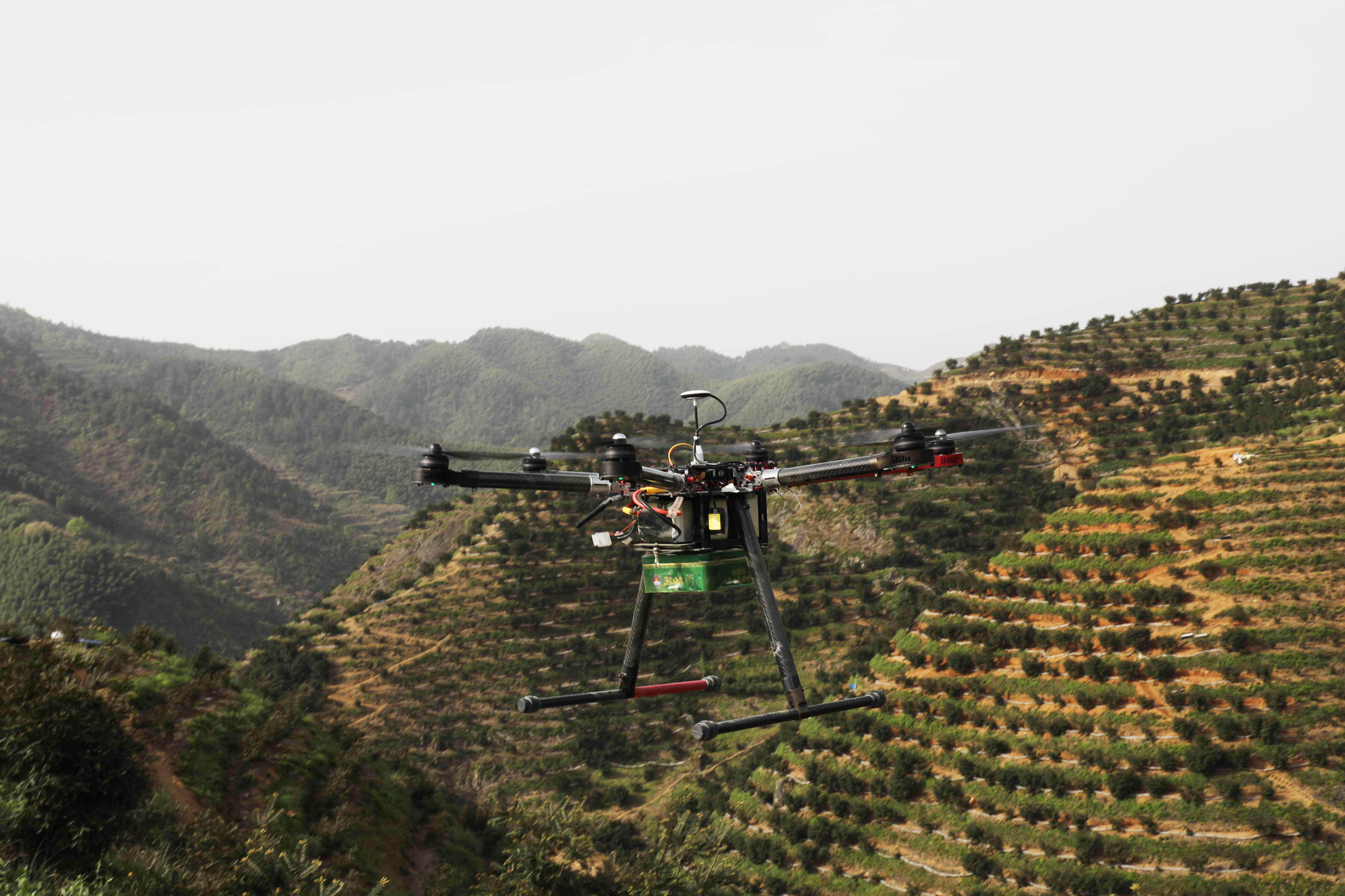 浦江县留家坪香榧基地,海拔高约200米。在戴文圣教授的指导下,浙江农林大学孵化园的同创无人机工作人员,在一块平地上开始了无人机授粉的试验:工作人员将一个设置有筛网的绿色四方铁盒,牢固绑定在无人机底部,随着无人机腾空远行,通过气流和风力将绿盒内的香榧雄花干粉吹散到空中,雄花粉自然飘落到雌花上,两至三个小时可以看出效果。