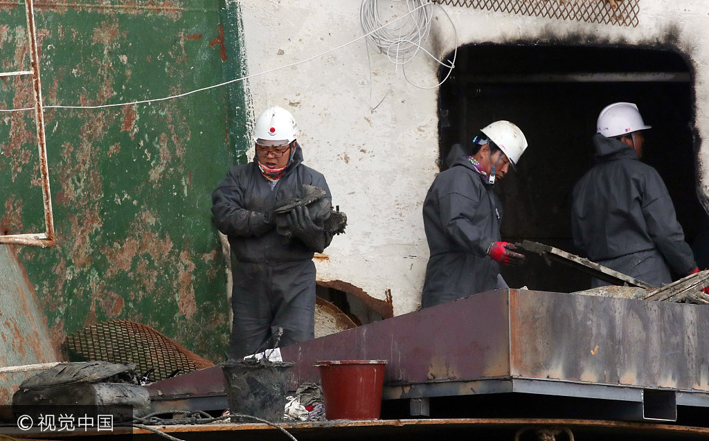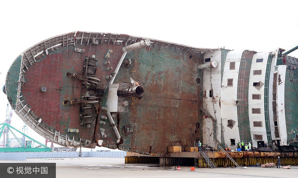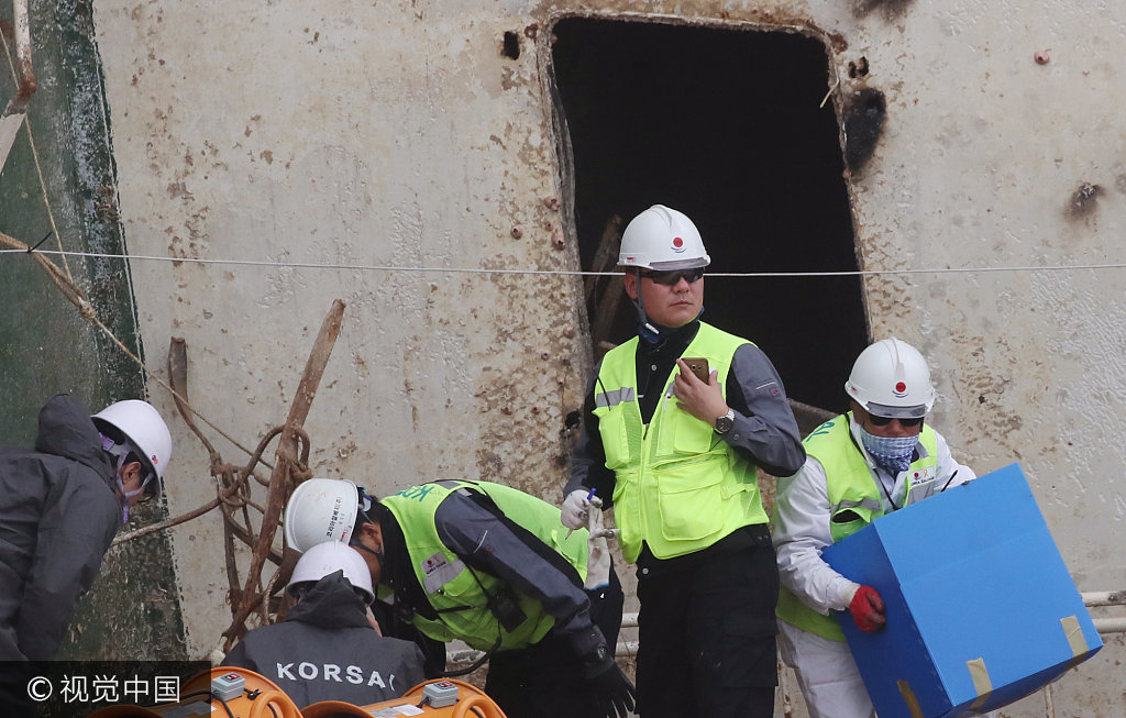 当地时间2017年4月19日,韩国木浦新港,工作人员正对“世越号”船体进行清理和搜寻工作。
