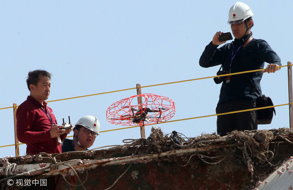 工作人员利用“无人机”对“世越号”船体进行清理和搜寻工作。
