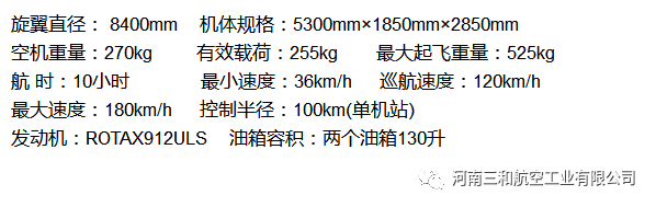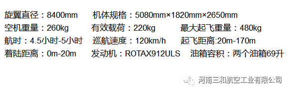 “太阳之鹰”自转旋翼机是河南三和航空工业有限公司自主研发、生产的开放式座舱,前后串列的双座旋翼机,除了具备旋翼机本身的稳定性高、安全性好、抗风性强、性价比高等特点,我公司还专门设计了整机弹射降落伞,在没有迫降条件的情况下飞行员可以打开整机降落伞进行整机迫降,大大提高了飞行的安全性。