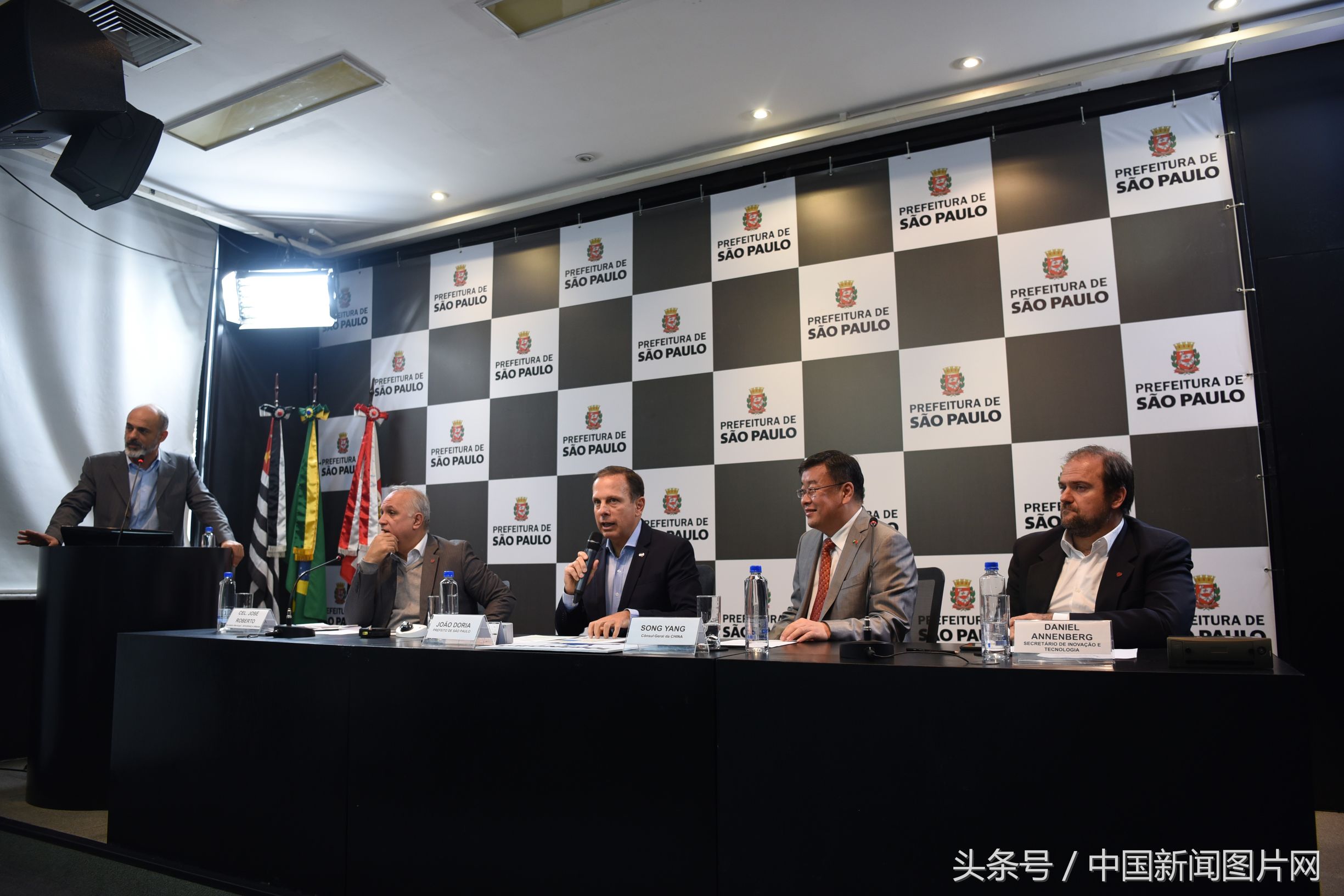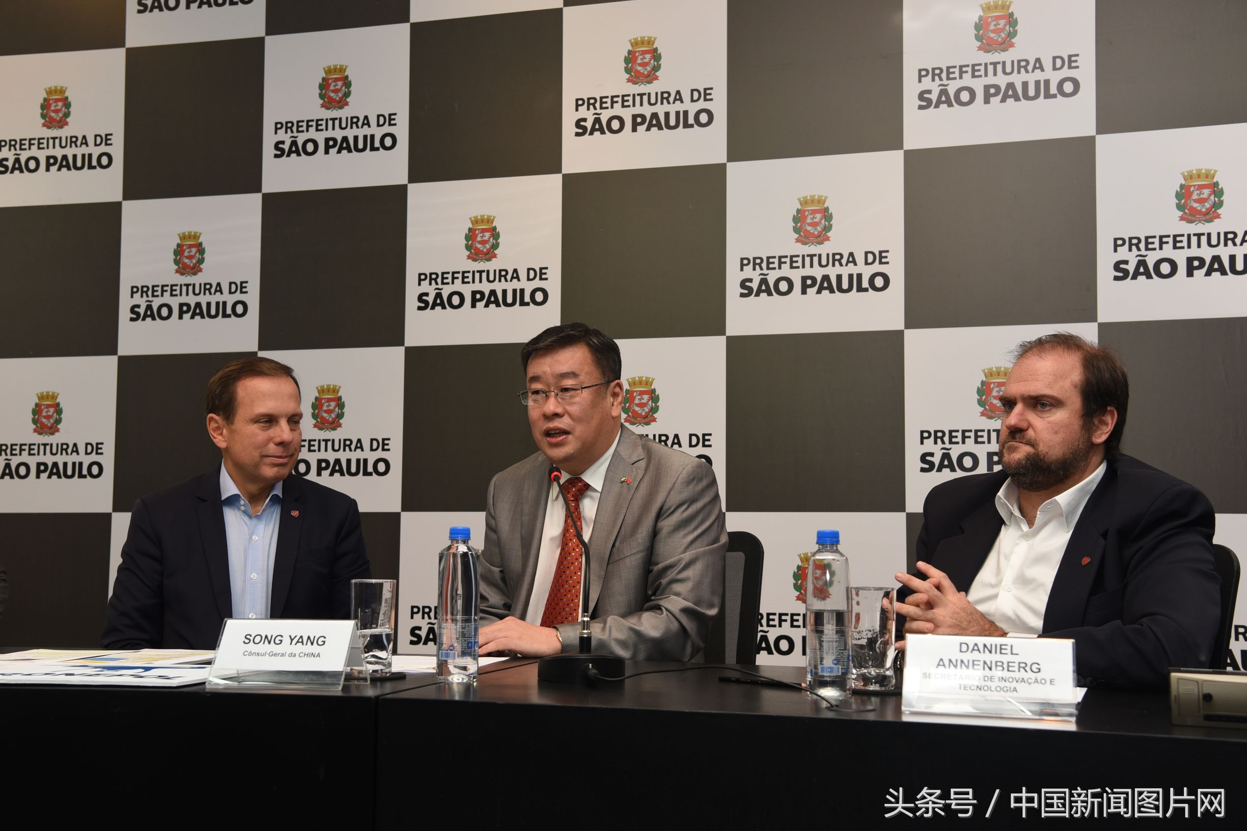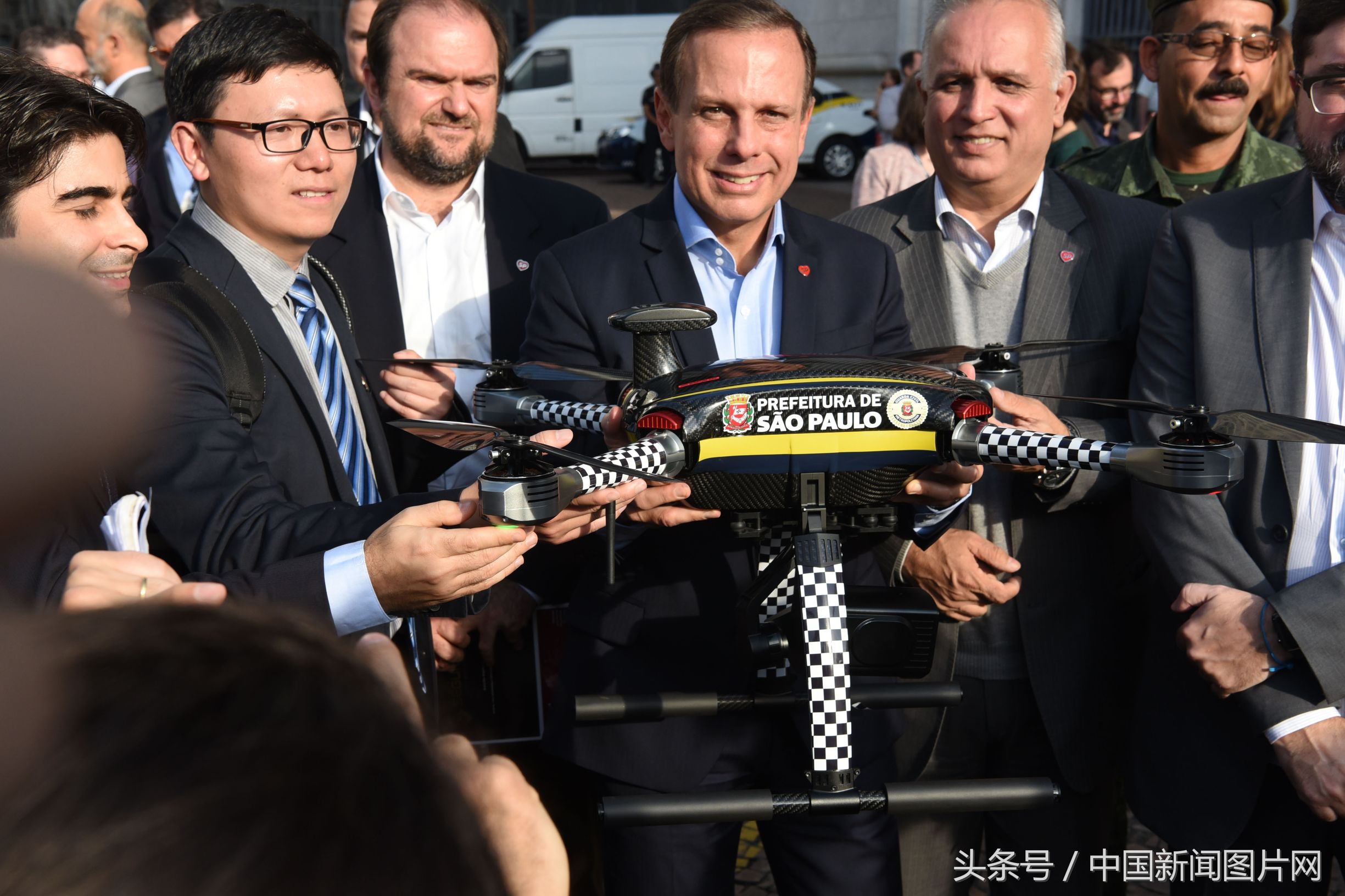 图为圣保罗市长若奥·多利亚(中)手持中国大华无人机。