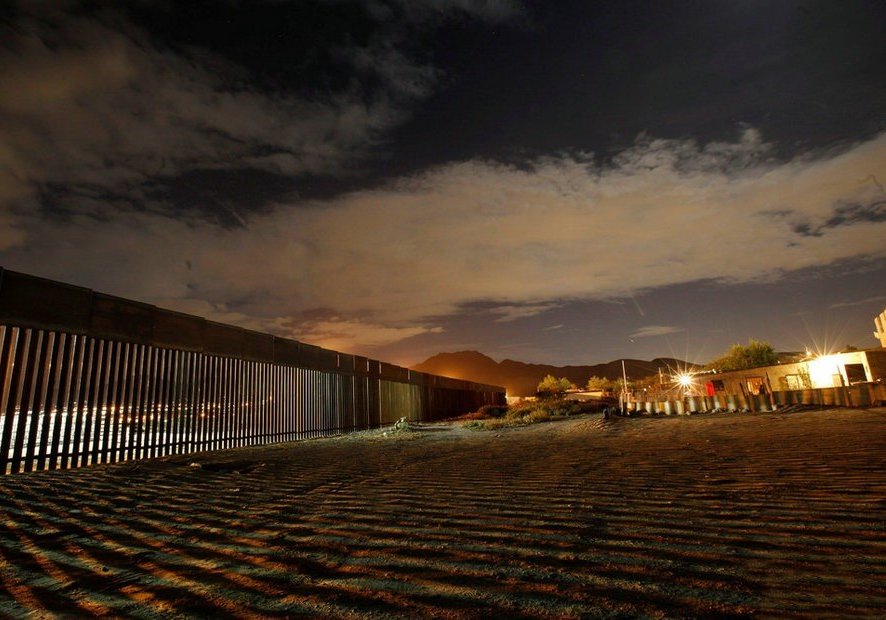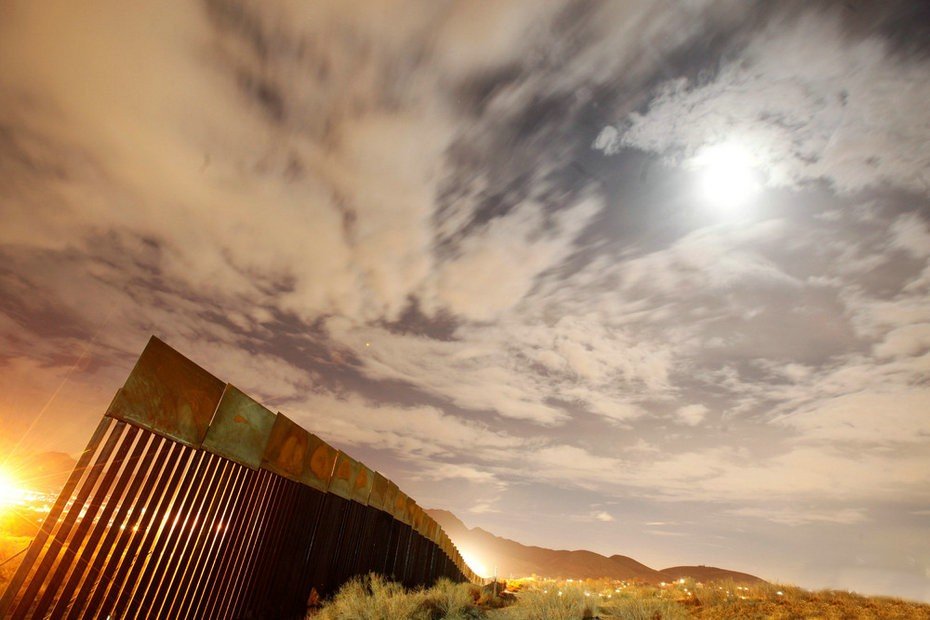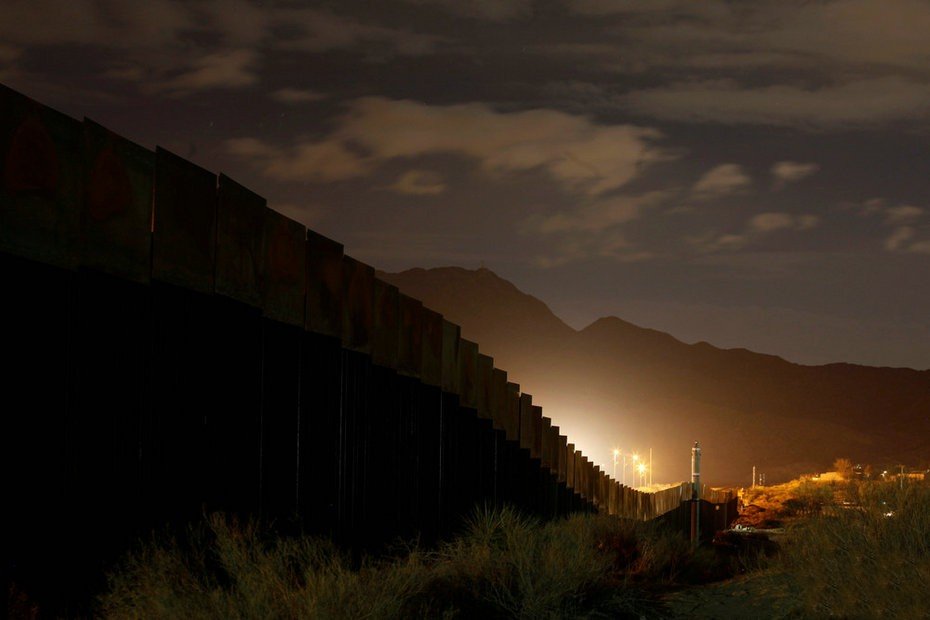 墨西哥华雷斯城郊区,灯光下,颇为壮观的美国墨西哥边境墙的其中一段。