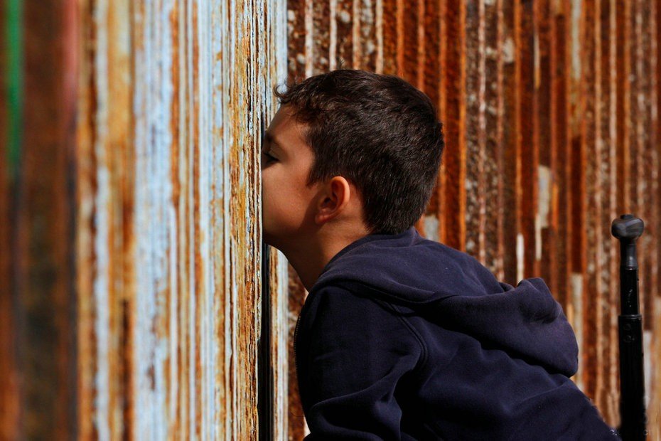 墨西哥北部城市提华纳,一个男孩和移居美国的亲戚隔着分割美墨的篱笆上说话。