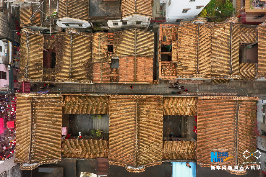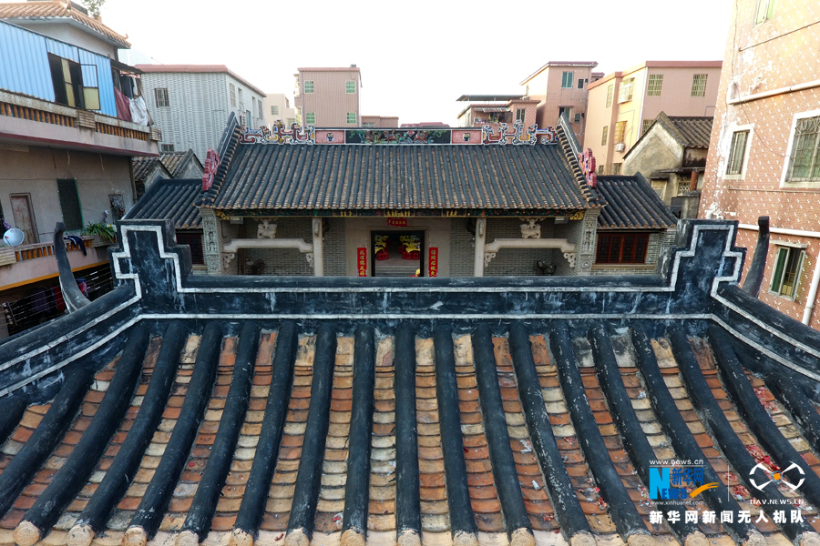 广州祠堂众多,是家族文化的一种寄托,有着深刻的寓意和深厚的岭南文化底蕴,蕴藏着对祖先、对传统、对宗族的敬重。南湾村位于广州市黄埔区,至今有六百多年历史。保存下来的历史文化史迹有麦氏宗祠、初泰麦公祠、敬祖麦公祠。图为航拍南湾村的祠堂。