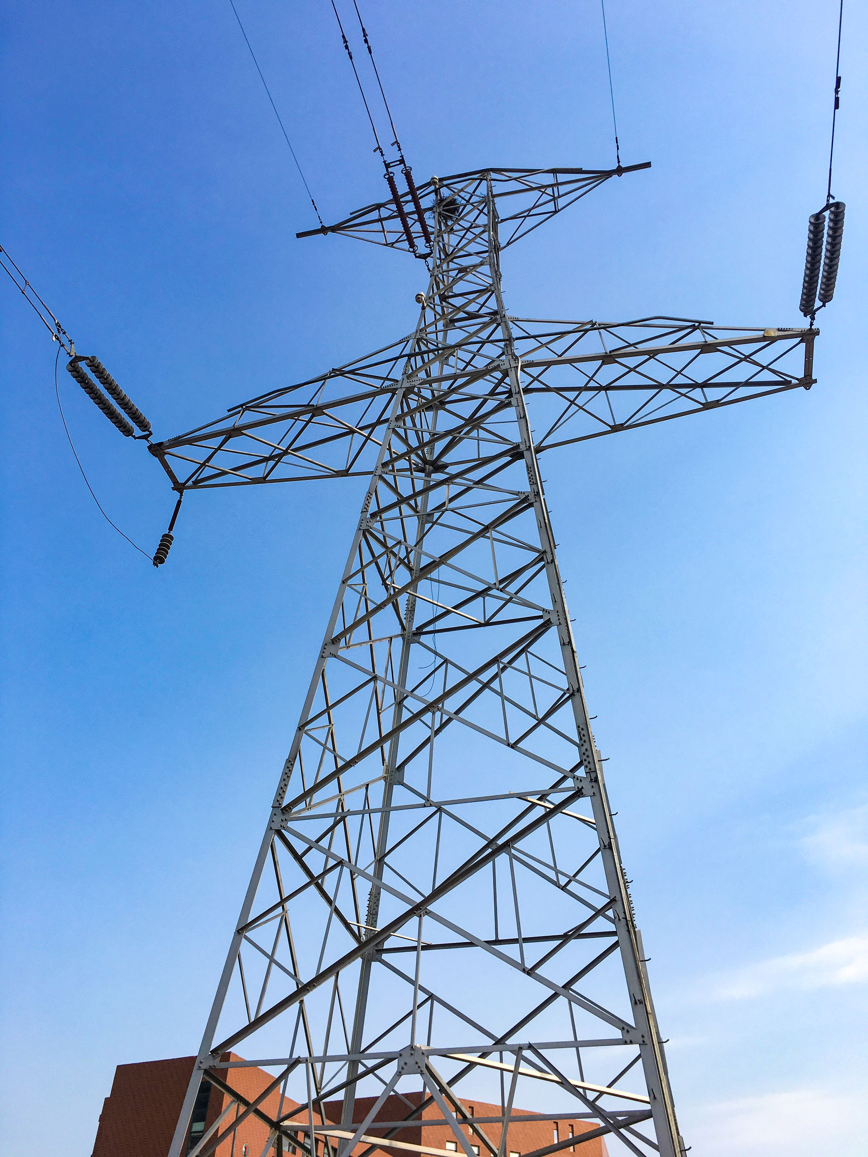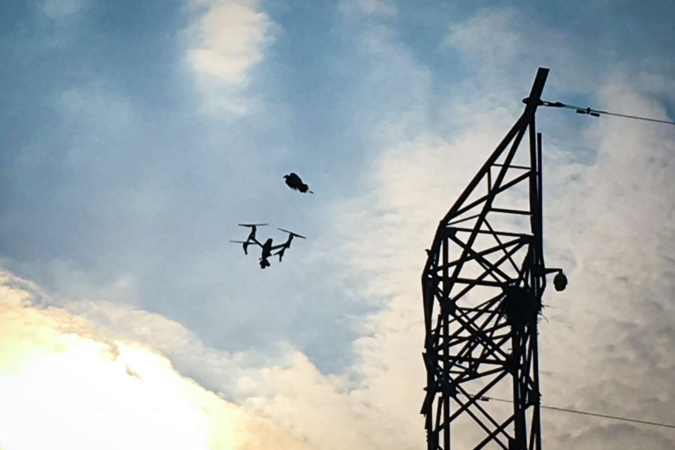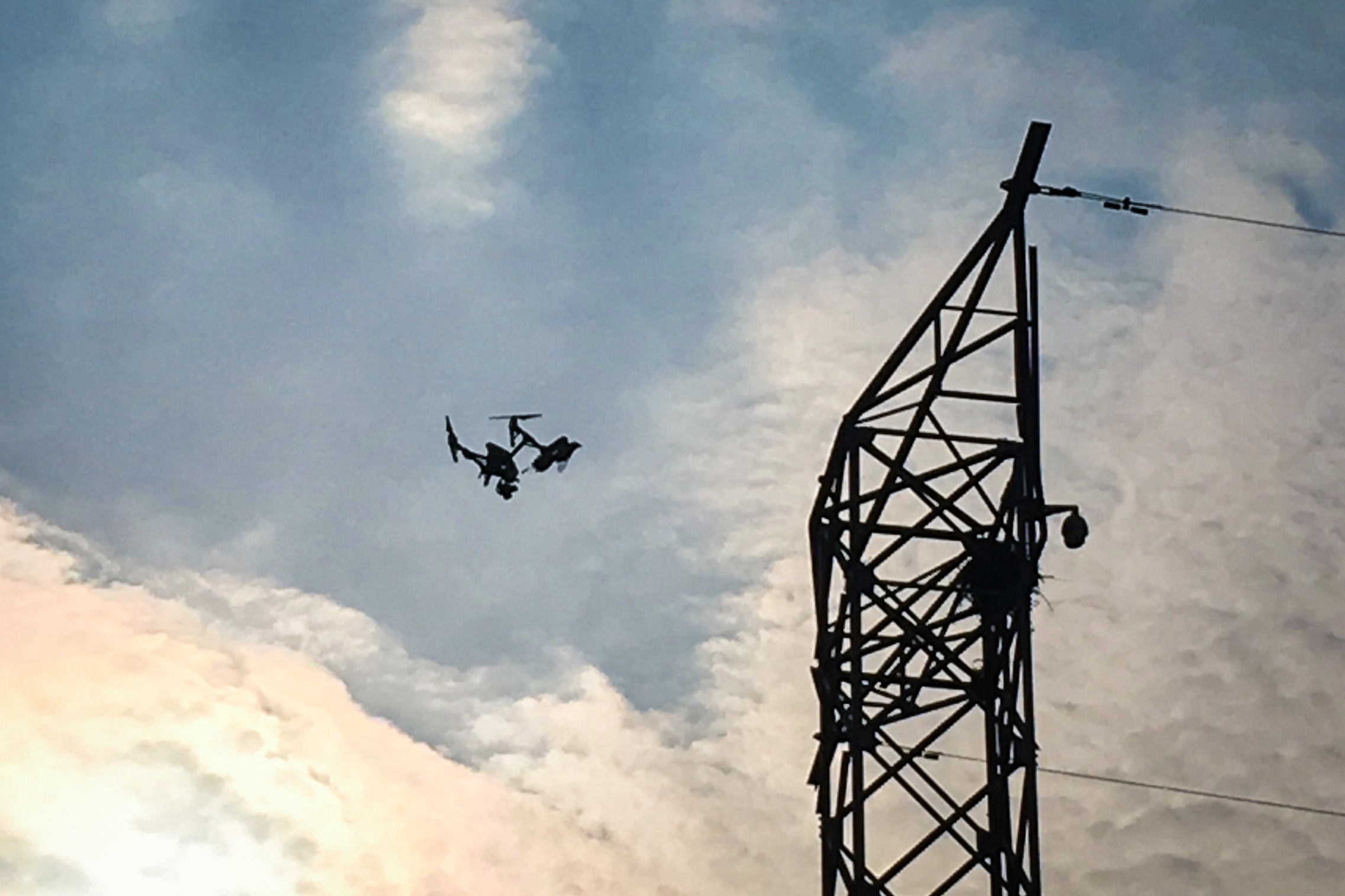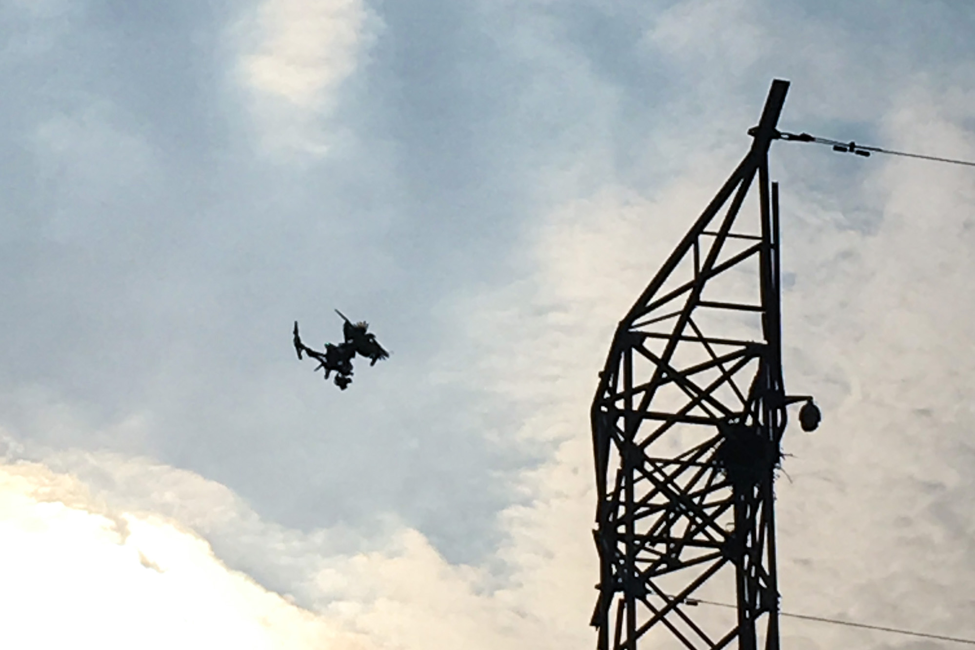 这个操场上有一个教学使用的高压输电铁塔,其上方有一个鸟巢,听朋友说建在铁塔上的鸟巢,会对输电线路造成影响,就遥控无人机飞进鸟巢进行观察。
