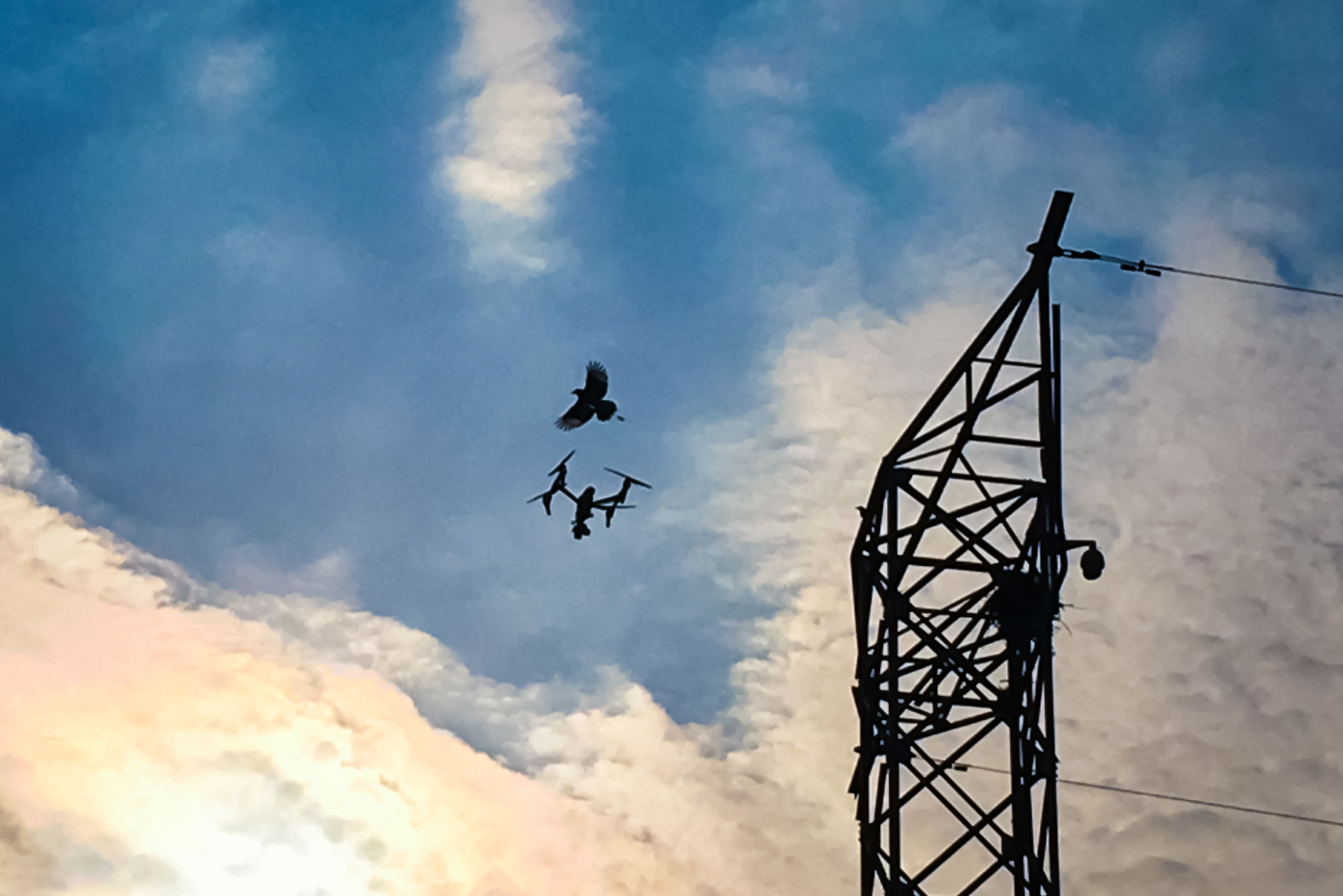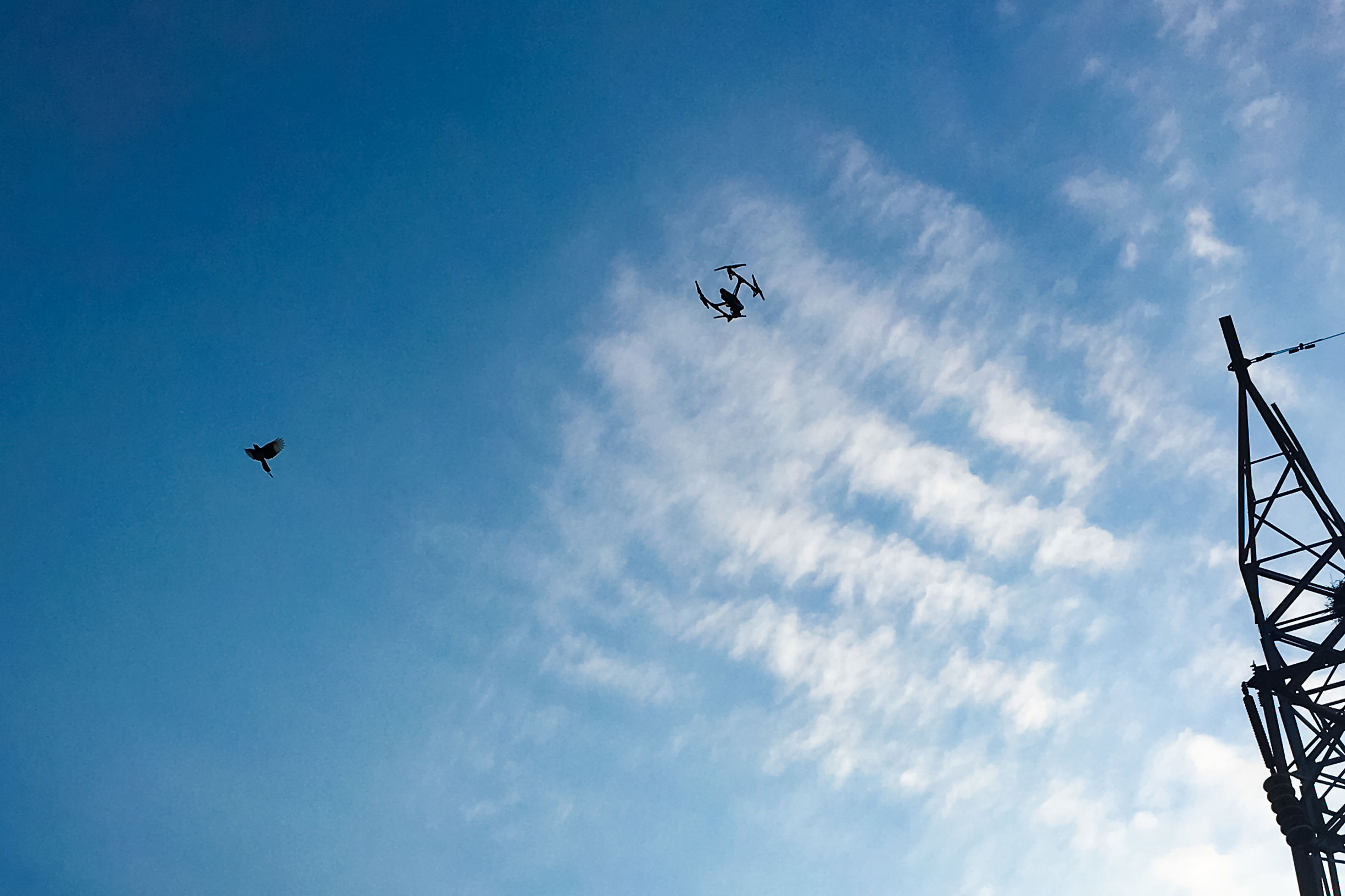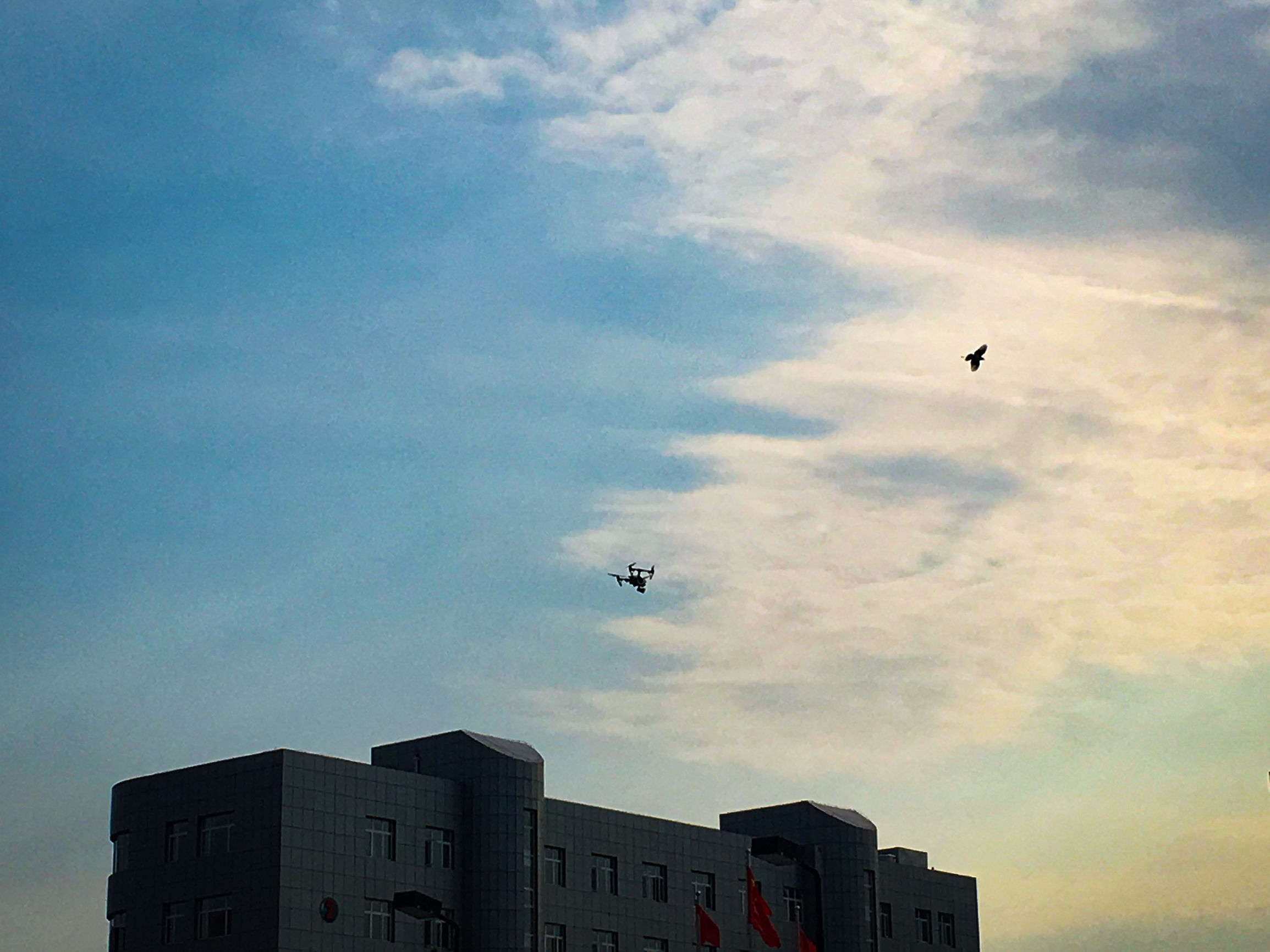 喜鹊在无人机旁边盘旋,叫唤着去攻击无人机。