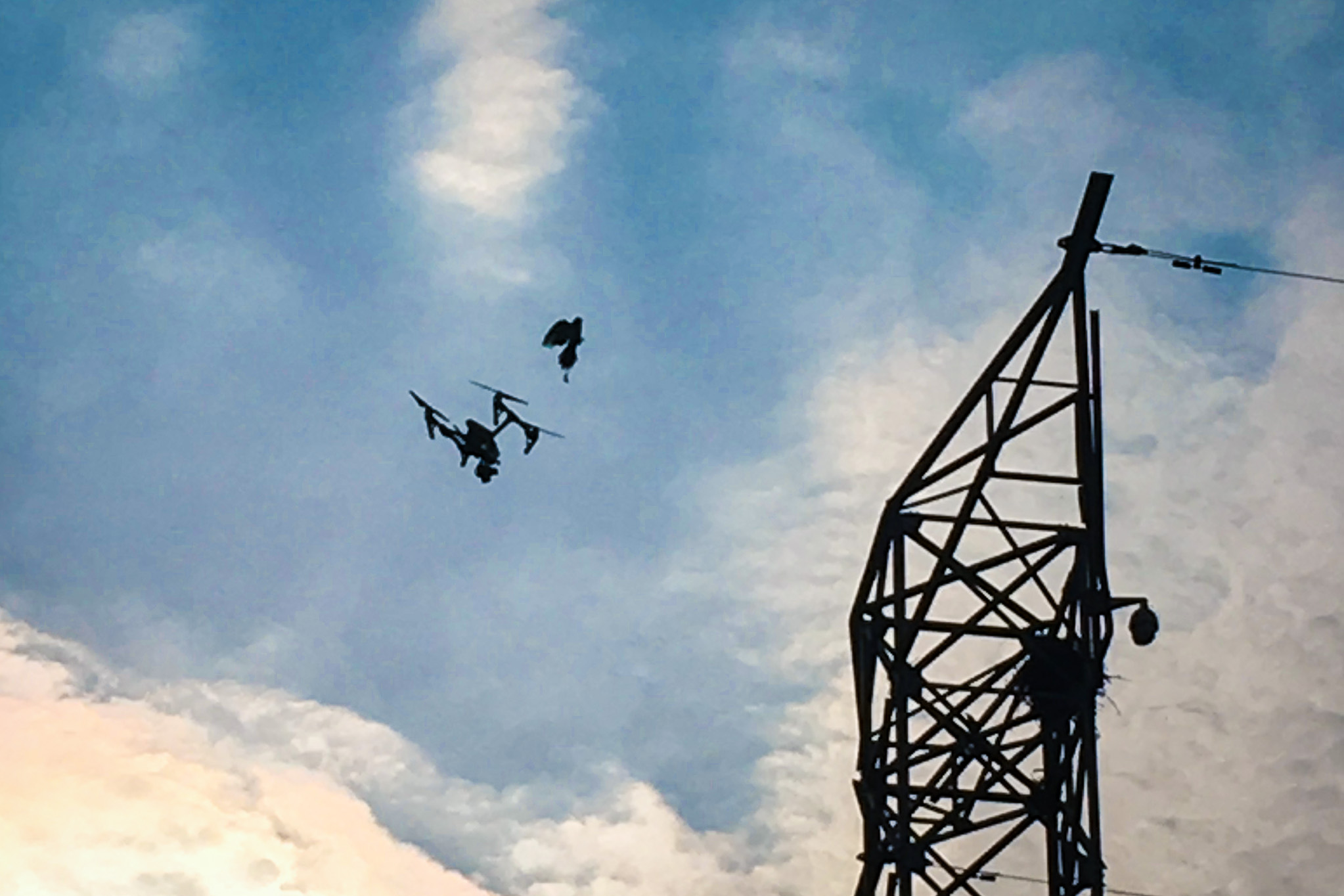 无人机慢慢飞近鸟巢,这时候喜鹊越来越激动,奋不顾身去攻击无人机。