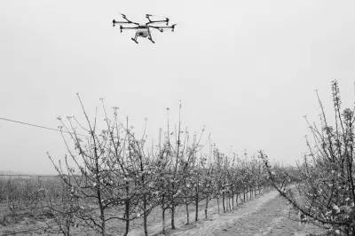 站在果园外,看着无人机在果树上空喷药作业,刘新柱头一回没有闻到刺鼻的农药味。