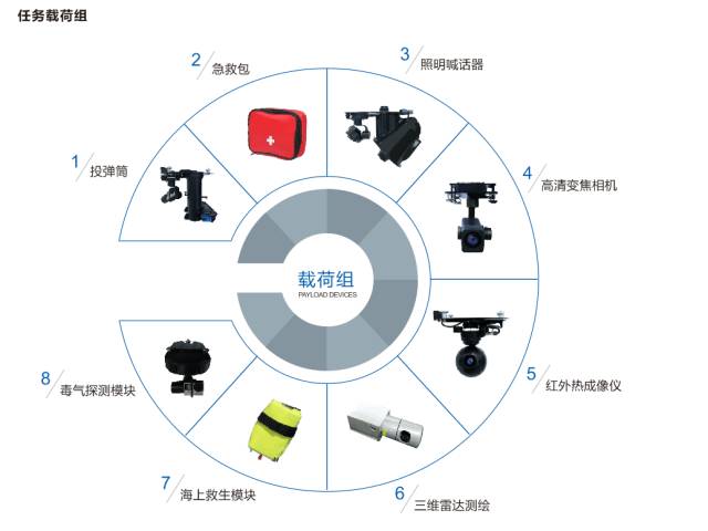 JTT无人机的应用领域很广泛,多旋翼无人机任务载荷组能通过载荷配备完成夜视、灯光、喊话、配送急救包的等任务,主要应用于警用、森林防火、电力、石油化工等。