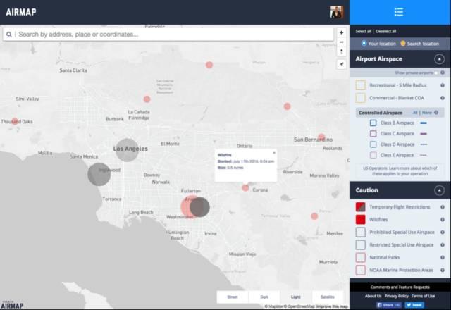 在美国每天发生300场野火,Airmap与中国大疆公司合作,将实时的野火警告信息嵌入地理防护数据中去,以便更好授权无人机进行防火及灭火操作,或者绕开危险路线,避免发生飞行意外。