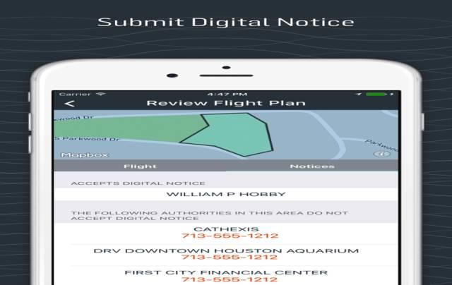 当你想要操作无人机在机场附近5公里内进行飞行,APP会给机场系统发出提醒,只需要点击提交数字通知便可开始飞行。