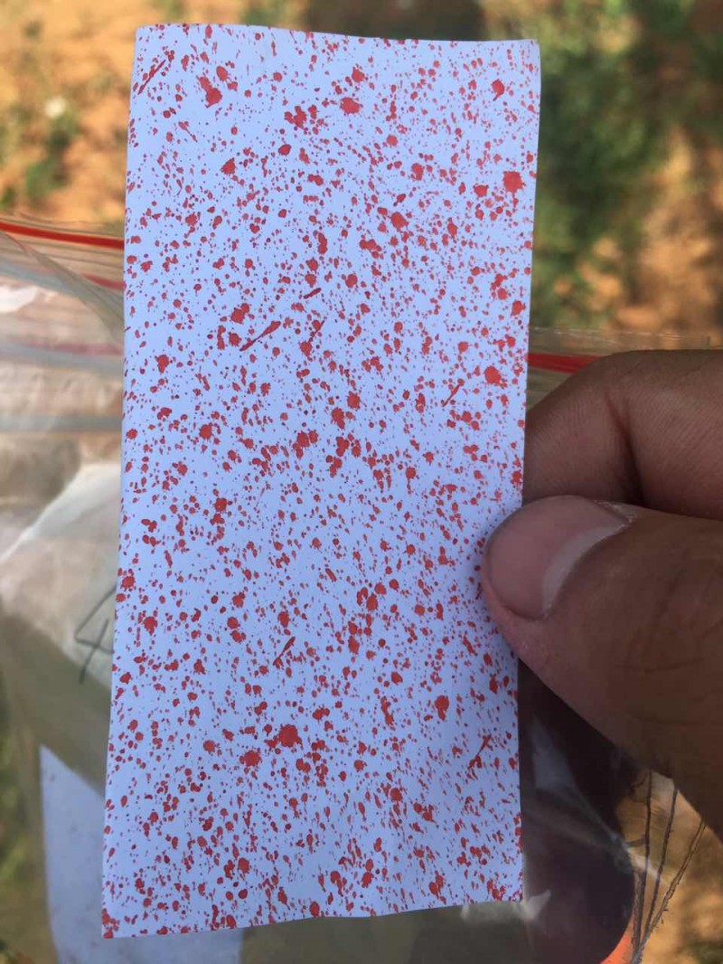 当天有5级风,测试纸布置了上中下三层,水星一号单旋翼向下风场大,有力量,抗风性强,对作物的穿透力强。不仅能覆盖每一株果树,树冠下方,叶子的正反面也全部能受药,而且雾滴密集均匀。