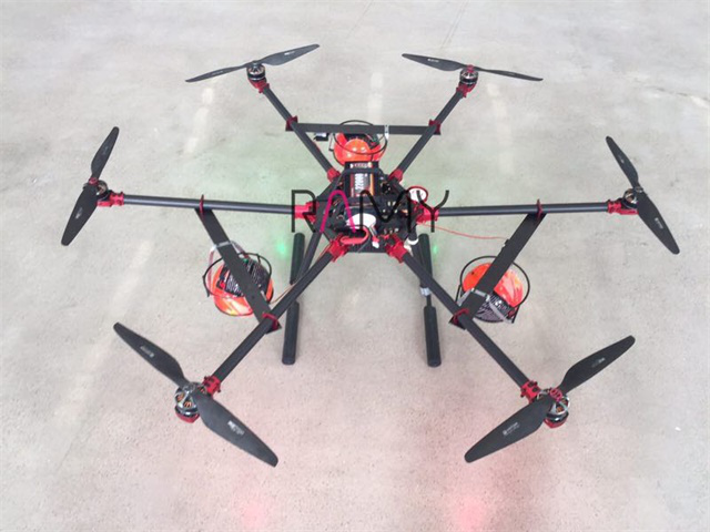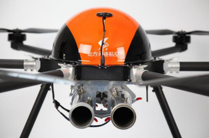 火灾救援时由于云梯受到高度限制,二十五层以上云梯够不着。且云梯升到空中后,受风力影响,会左右摇摆,增加救火难度。水枪、水炮也需要加压,水才能上到高楼。对于目前城市化的发展,高楼、超高层大厦越来越多,一旦高楼起火,轻者烧毁建筑物,重者人员伤亡。给社会造成极大的经济损失,高楼灭火也成为日益严重的社会化难题。该款无人机不管多高的大厦,都可以利用消防无人机进行直接灭火。