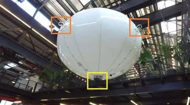 Spacial Halo的气球机身上装设了4组小型旋翼(橘色),用作控制移动方向;底部则挂载DJI Zenmuse X5云台相机(黄色),可拍摄4K画质的空拍图象