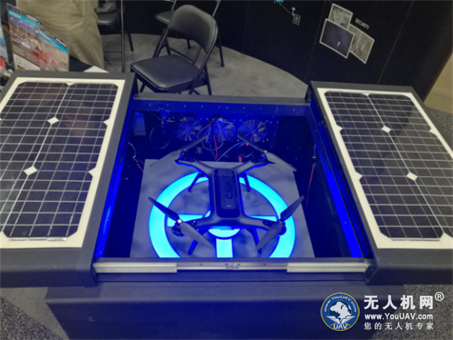h3 dynamics无人机和其DRONEBOX在XPONENTIAL 2017(盒子左右两侧是可移动的太阳能板)(无人机网(www.youuav.com)现场拍摄)