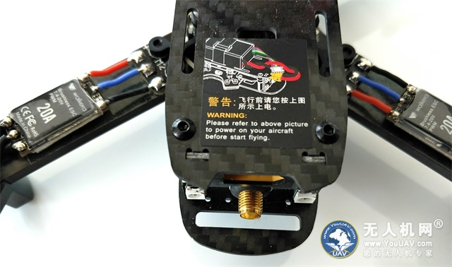 Furious 215为了加电池的安装空间将电池接口和图传天线都移至到机尾。这样的设计可有效的增加安装电池的长度,大多数玩家都知道市面上的电池尺寸不一,有些品牌的穿越由于其设计的缺陷只能限制某些尺寸的电池,对于不同型号和尺寸的发烧友来说这简直是个鸡肋。同时,不难发现Furious 215下底板略长于上板,与其他品牌穿越机相比,经一些测试发现前置的天线受损程度要比后置厉害一些,因此Furious 215这样的设计可免图传天线遭受冲击损害。