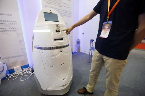 这台智能安保服务机器人是国内首款集安全防护与智能服务为一体的军民两用新型机器人,具有自助巡逻、智能分析、紧急呼救、遥控制暴、智能交互、媒体播报、业务办理、云数据服务等核心功能。