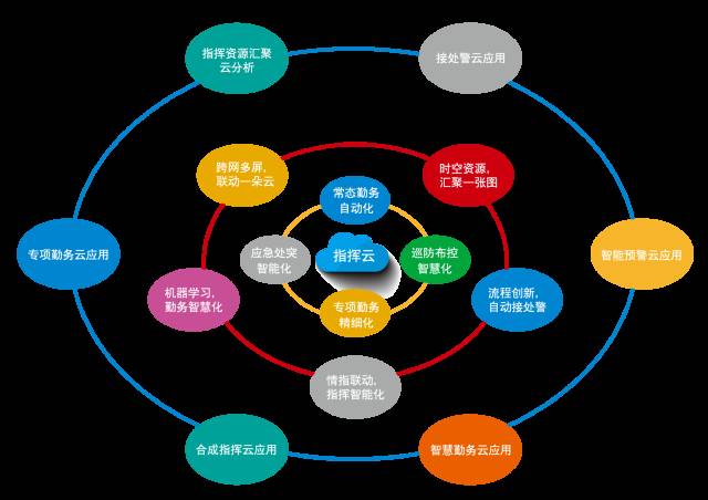 通过应用云计算、时空大数据挖掘、机器学习等新技术实现智能预警,快速调度,合成指挥,精准打击,一朵云上构建集情报、勤务、指挥、行动四维一体的智能可视化指挥云平台。