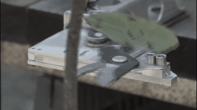 Hyneman卸掉树剪的把手并将其安装在可以控制刀片开合的电机上。该机制连着无人机机身延伸出来的脚架上。为了稳定,他临时设计了一套减震系统,使用的是泡沫护耳罩上的弹力带。