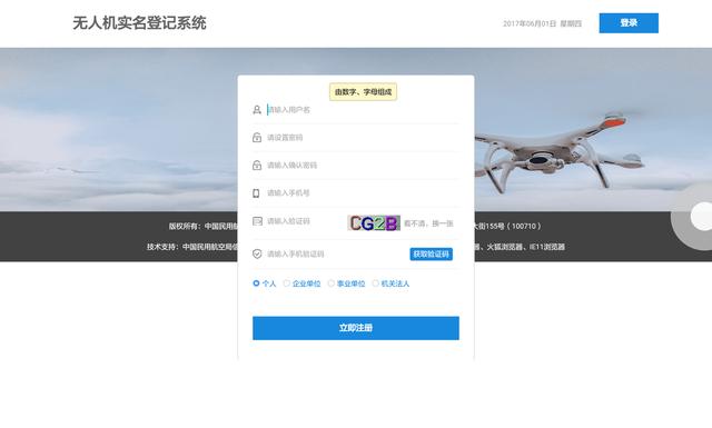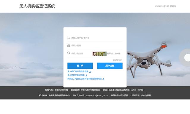 在下也是积极配合相关部门工作,网上四处打听,去过不止两次公安局,打过不下四次电话,民航局也都咨询过,但得到的结论是:无人机目前都不归他们管,民航局也只是管里禁飞区域内飞行登记的事情,我的登记在策避免黑飞也就一直没有落实;多余的不说了,问题终于得到解决了,就在今天,6.1儿童节,无人机登记管理系统上线了,想必各位都知道。