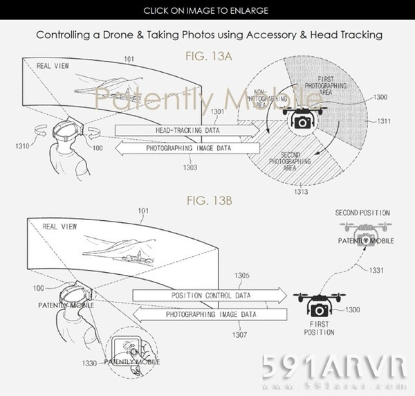 如专利图 13A 和 13B 所示,我们可以看到新的 Gear VR 应用通过单手操纵触控板或轮键输入,然后简单地移动头部来拍摄全景照片。Gear VR 还将能够与未来的无人机设备配合使用,通过头显各种新的输入配件进行控制。