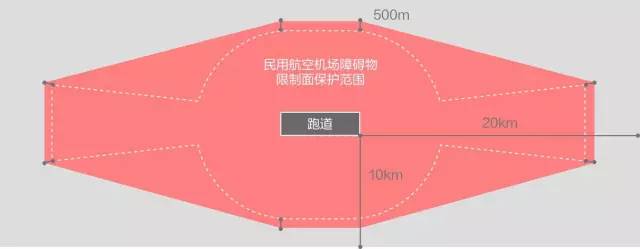 以跑道两端中点向外20公里,跑道两侧各延伸10公里,形成大致为20公里宽、40公里长的长方形区域的外接圆为限飞区(与禁飞区不相交的部分)。在限飞区中,飞行器的限制高度为120米。