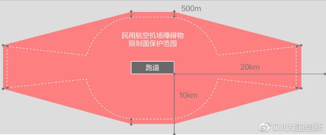 其中红色多边形部分为机场禁飞区,大疆在民用航空局定义的机场保护范围的坐标基础上向外延伸500米(外围的8个坐标点),形成新的坐标点内的八边形区域则是禁飞区。