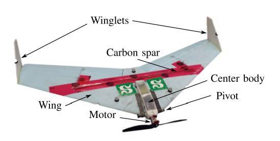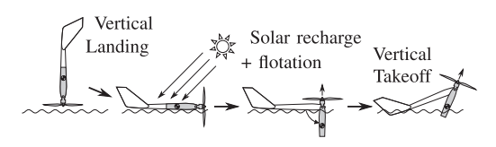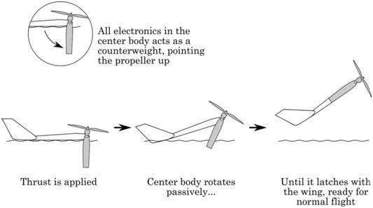 一旦发动机启动,将牵引无人机从水中飞出并升空,机身中部也将摆回与机翼对准并锁紧。除了闩锁之外,整个起飞方法都是无源的,并不需要任何传感器或者驱动器。并且,必要的时候还能用于翻转整个机身。