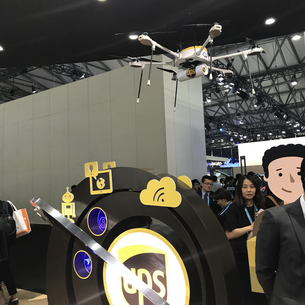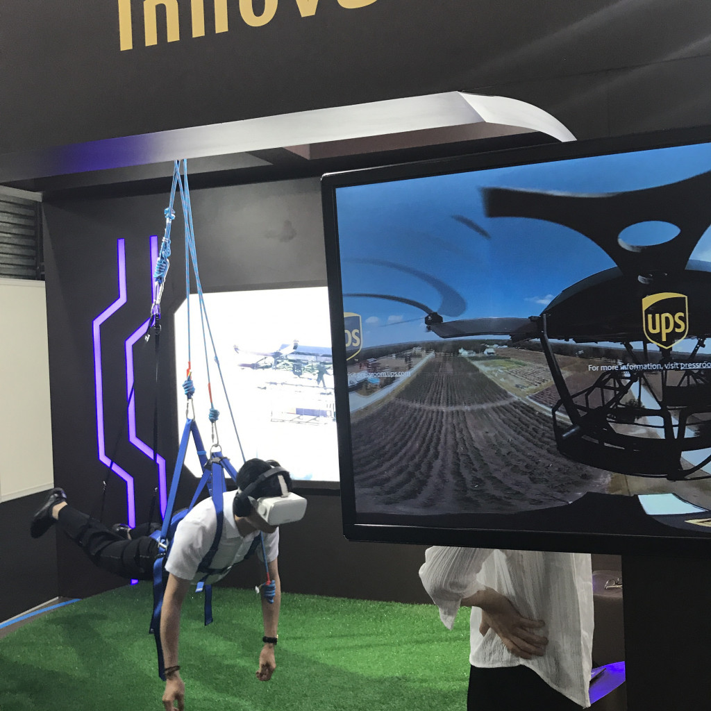 为了让普通人对无人机送货的了解更形象,UPS 甚至在自己的展位上还设置了专门的体验专区。可以带上 VR 眼镜通过第一视角的方式,看到货物是怎样通过无人机进行运输的。