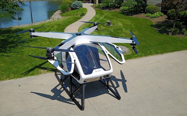 从外观上看,SureFly 的造型就像一个大型的 8 旋翼无人机,其内置了双人座椅,能承载 400 磅(约 180 公斤)的重量,可在携带两名乘客的情况下持续飞行 70 英里的路程,最高时速可达 70 英里/小时,最高飞行海拔约为 4000 英尺。