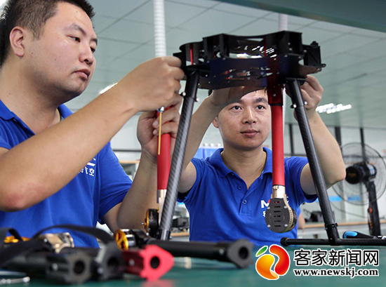 图为大余县科比特无人机航空产业园生产车间员工正在组装无人机机架。