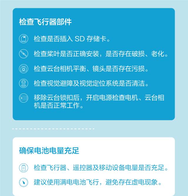 除了了解安全飞行区域,也需要掌握对飞行器的自检技能。接下来,跟着大疆服务一起看看飞行前有哪些必做事项,将这份飞行安全自检指南加入你的收藏。