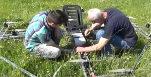 无人机的英文是Unmanned Aerial Vehicle(简写是UAV),意思是无人驾驶飞机,最开始的理解都是不载人的无人飞行器。但是在今年的2月17日,中国的亿航无人机公司生产出世界上第一款载人的无人机——“亿航184”而预计在今年的7月份,迪拜会成为世界上第一个允许载人无人机飞行的城市(虽然目前还没有什么消息)。从此,无人机被重新定义,只要不是有操作人员驾驶的飞行器,也属于无人机。也正是有鉴于此,国内外的无人机爱好者及一些厂商们,也在探索载人无人机的研发和制作。而今天小编带来的也正是国外的一堆爷孙俩一起动手制作的载人无人机。