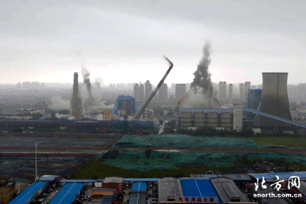 2017年6月23日,天津陈塘热电公司对厂区内三个烟囱和一个冷却塔实施爆破拆除工程。爆破共设15个警戒点,两个交通管制点,交通管制点位于洞庭路与延水道交叉口、洞庭路与浯水道交叉口。区域内道路使用警戒带戒严,警戒人员佩戴红色执勤袖标。上午9点56分,陈塘庄热电厂水塔成功执行爆破拆除工作。(“津云”—前沿新闻记者戴涛)