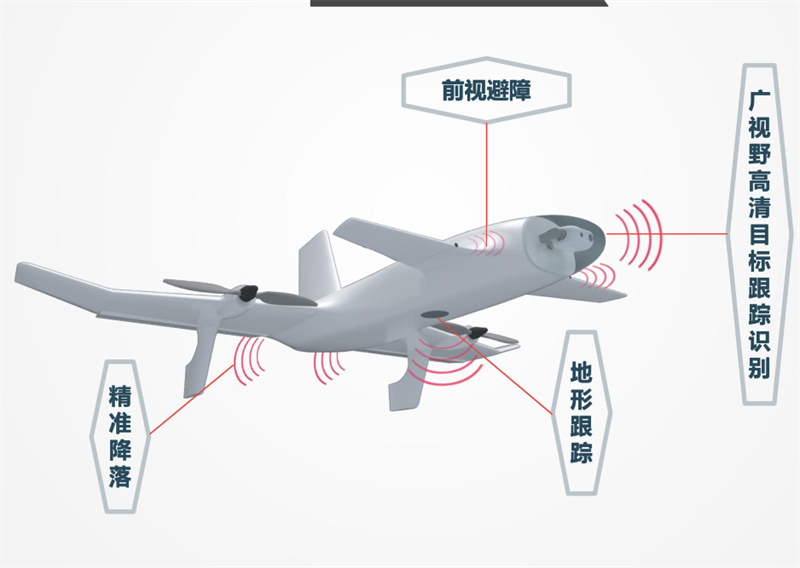 翔鸿灵动1500无人机具备全视野立体感知功能,其顶端机头处可以安装高清摄像云台,增加视野的开阔性,从而有利跟踪识别目标。前部鸭翼端可安装双摄像头,从而可有效的对物体进行判断识别增加现实避障能力。然而,在机腹可安装双摄像头,在平飞时就能跟踪地形及视觉导航。最后,在机身后缘配置双摄像头,实现精准垂直降落。