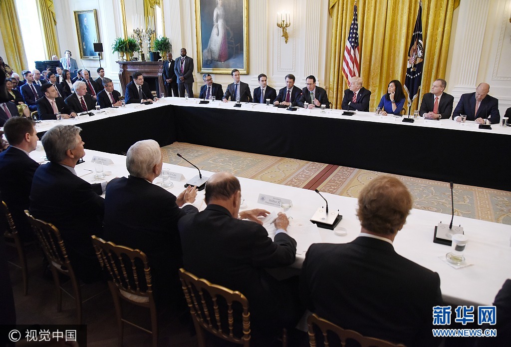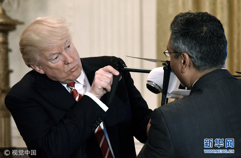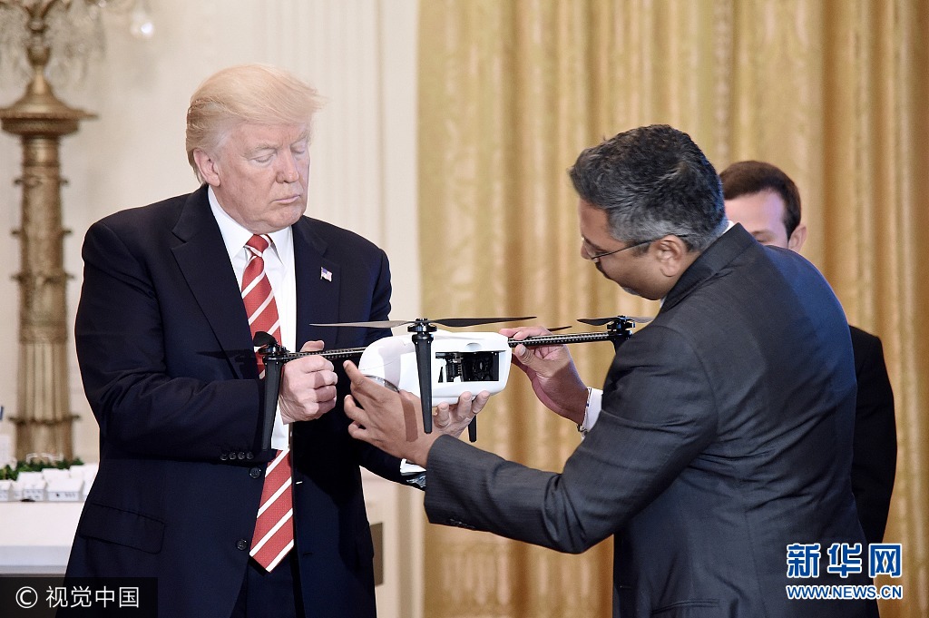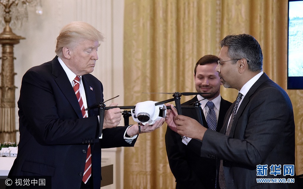 当地时间2017年6月22日,美国华盛顿,美国总统特朗普参加在白宫举行的新兴技术峰会。图为 Kespry公司的CEO乔治·马修在向手持无人机的特朗普解释其工作原理。