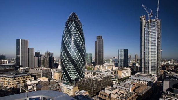 从专利上看来,其中一种无人机塔设计方案是子弹头状,爱范儿(微信:ifanr)根据英国伦敦的瑞士再保险公司大楼(The Swiss Re Building),大胆脑补了蜂巢式无人机塔投入使用的场景: