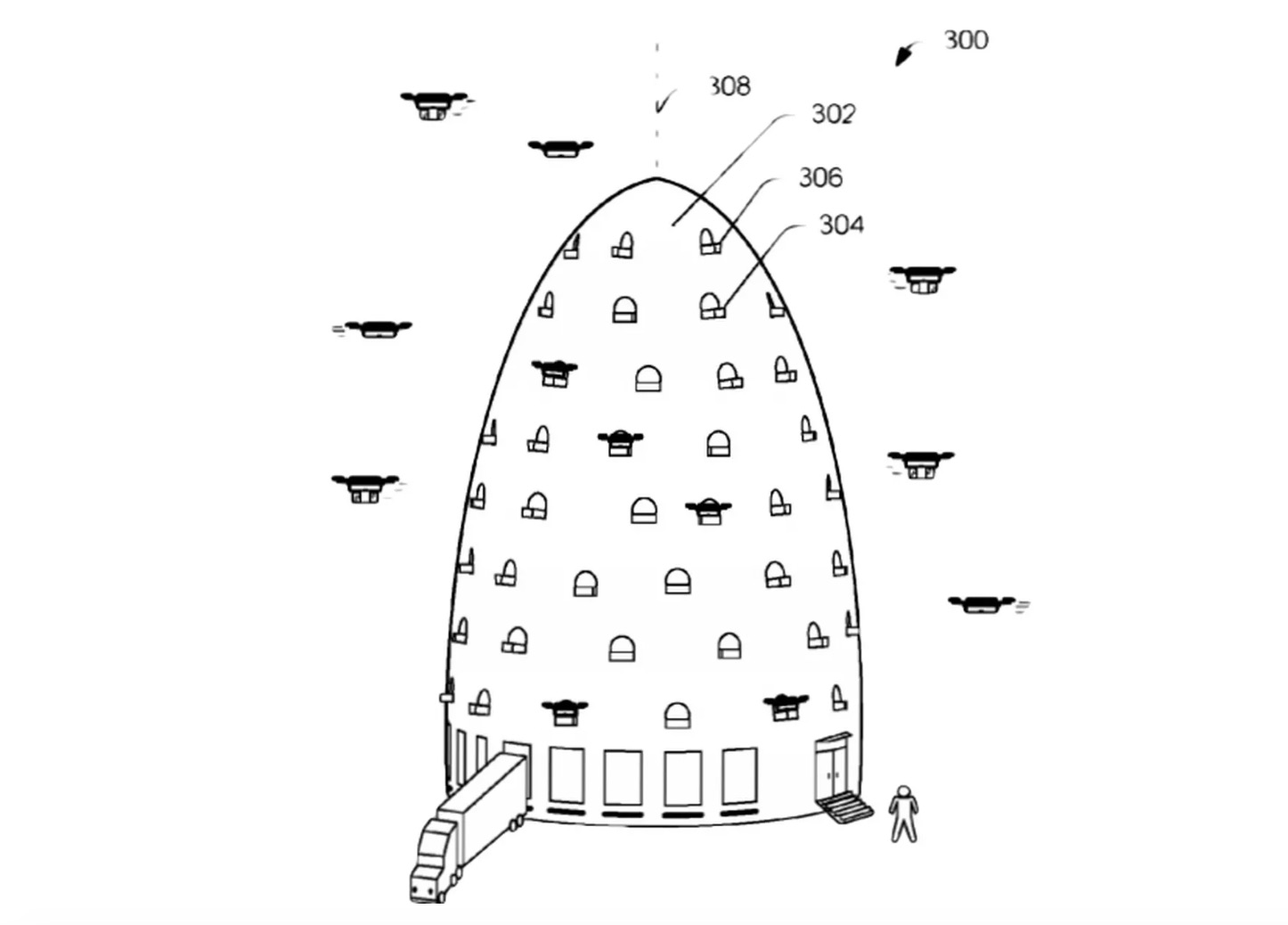 即使我们只能看到专利书上的简笔画,依然能感觉到亚马逊蜂巢式无人机塔的未来感十足。无人机塔为多层设计,底部让人员及车辆进出,往上则是让无人机进出。