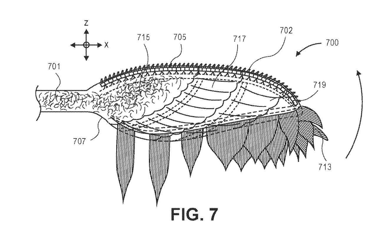 为了让无人机飞行时能够减少噪音,亚马逊提交的专利中有多种螺旋桨设计方案。其中有减小叶根附近切面的螺距,仿照飞鸟翅膀和高尔夫球表面来改变螺旋桨表面形态等等,都是为了调节螺旋桨周围气流,从而达到降噪的目的。