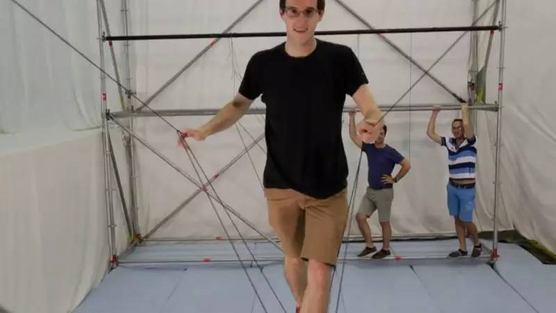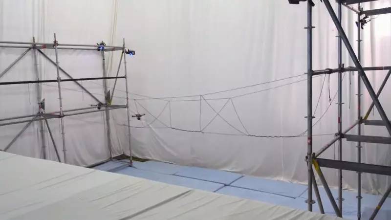 以及操纵无人机用绳子编出一座简易桥梁(确实可以使用)。