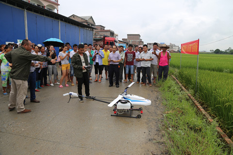 现场会上由田阳县龙友百香果种植合作社植保飞防队操作轻型无人机进行喷药,无人机具有效率高、节水节药、喷洒均匀、节省劳动力等特点,该机一次可飞行十分钟,喷洒农药作业面可以达到十亩地左右,并可根据农作物和药品的特点,地理位置等来调整飞行速度和高度。同时,使用无人机通过空中作业有效避免人为机械造成的农作物损害。以往稻田打药都需要人工背着药壶打药,人工喷洒农药每人每小时只能喷1亩地左右,不仅作业劳动强度大,作业时间长,而且长时间在稻田里喷施农药,透风透光性差,容易引起作业人员药物中毒。且人工喷施在对高大密集型农作物作业时更是无能为力,从而导致病虫害防治效果较差。利用无人机螺旋桨向下强大旋转气流,在喷洒农药时,可以在翻动和摇晃农药的同时,在下方的农作物形成一个紊流区,可以非常均匀的喷洒药物,更全面的做好病虫害统防统治。