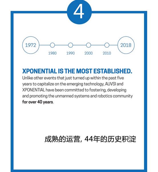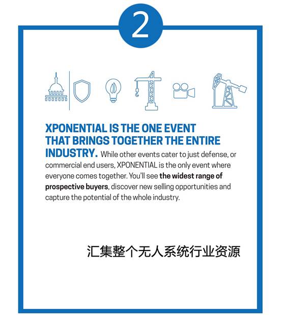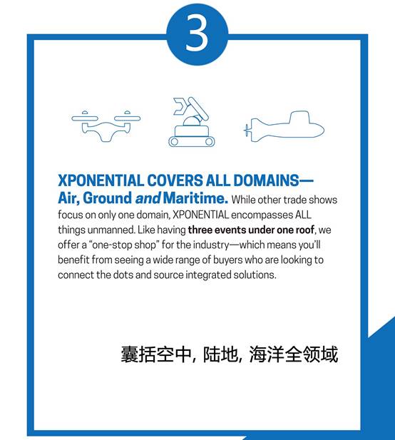 AUVSI旗下的XPONENTIAL(美国无人操控系统展)是全球无人机、机器人和无人驾驶领域规模最大,覆盖面最广的展会。展会每年吸引近700家参展商,来自55个国家和地区的8000多个企业和行业精英共同参与。它不仅为企业提供了捕捉商机的机会,也为专家和学者提供交流的机会,每一个参加者都会从中受益。