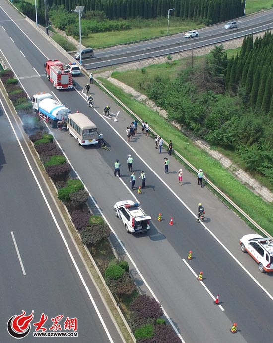 6月27日上午9点,济南东绕城高速上一辆中巴车与一辆罐车相撞并“起火”,齐鲁交发信息监控中心通过视频巡检发现后立即启动应急处置预案,向交警、路政、救援、消防和医疗救助等单位通报。这是齐鲁交发、济南交警、市公路局、济南消防支队、急救中心等部门展开的一场交通事故应急处置演练。上述部门接到警情后迅速到达现场,并按照职责分为事故现场处置、交通分流、应急救援等6个工作组,根据预案对现场进行了应急处置。这次演练中,济南高速交警出动了警用无人机进行现场勘查,协助指挥部进行现场处置指挥。